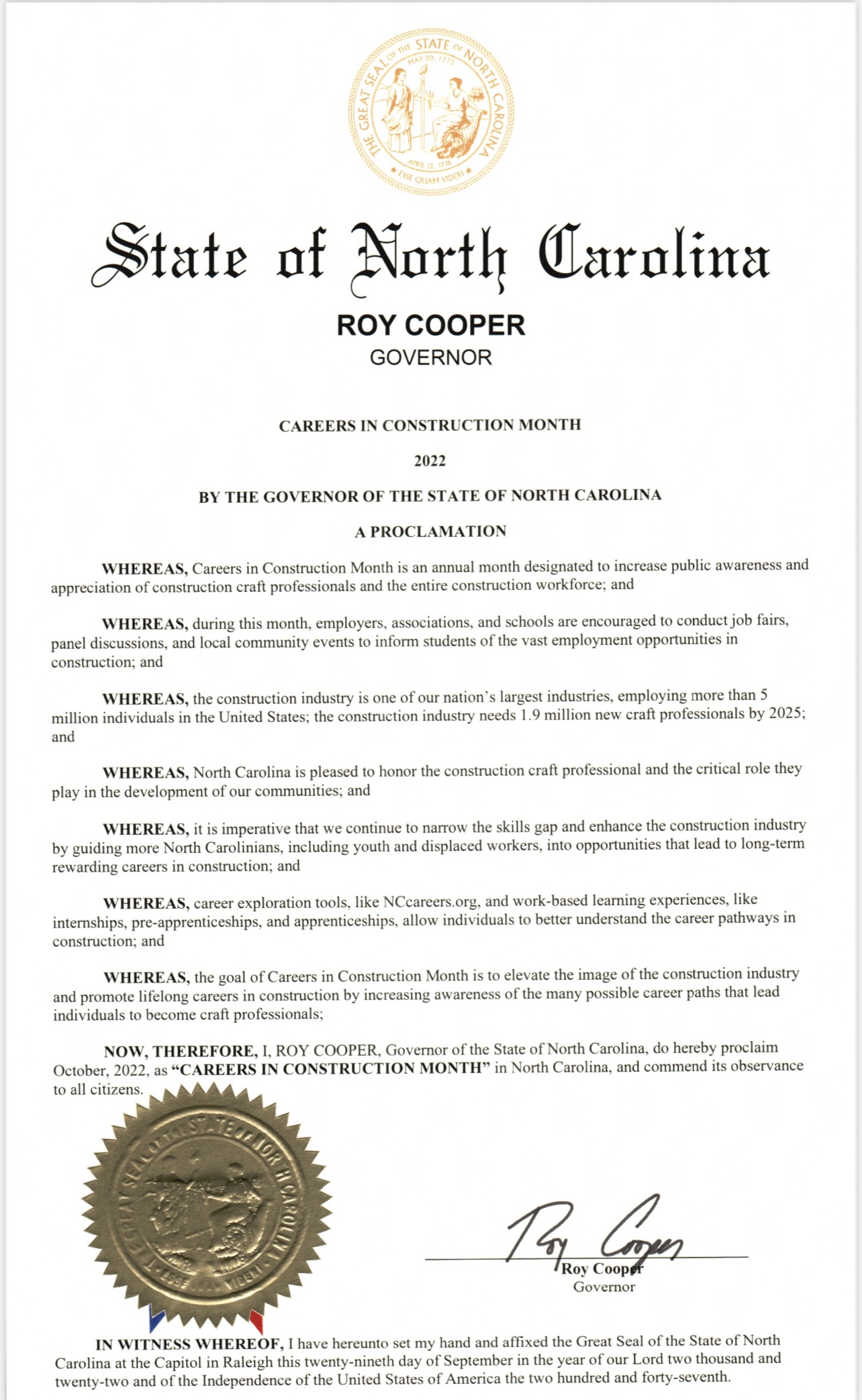 The State of North Carolina has joined states across the country to designate this month as ‘Careers in Construction month’ and we appreciate this effort to garner awareness and appreciation for the talented men and women who bring ideas into reality through their craft.