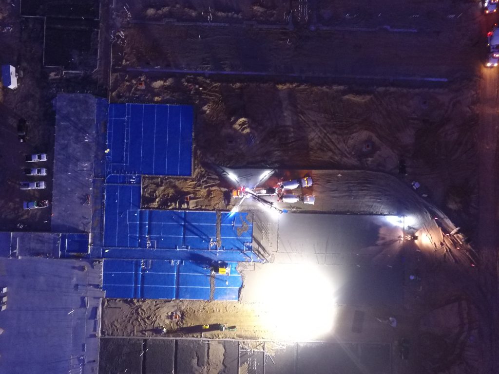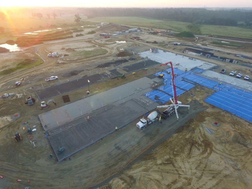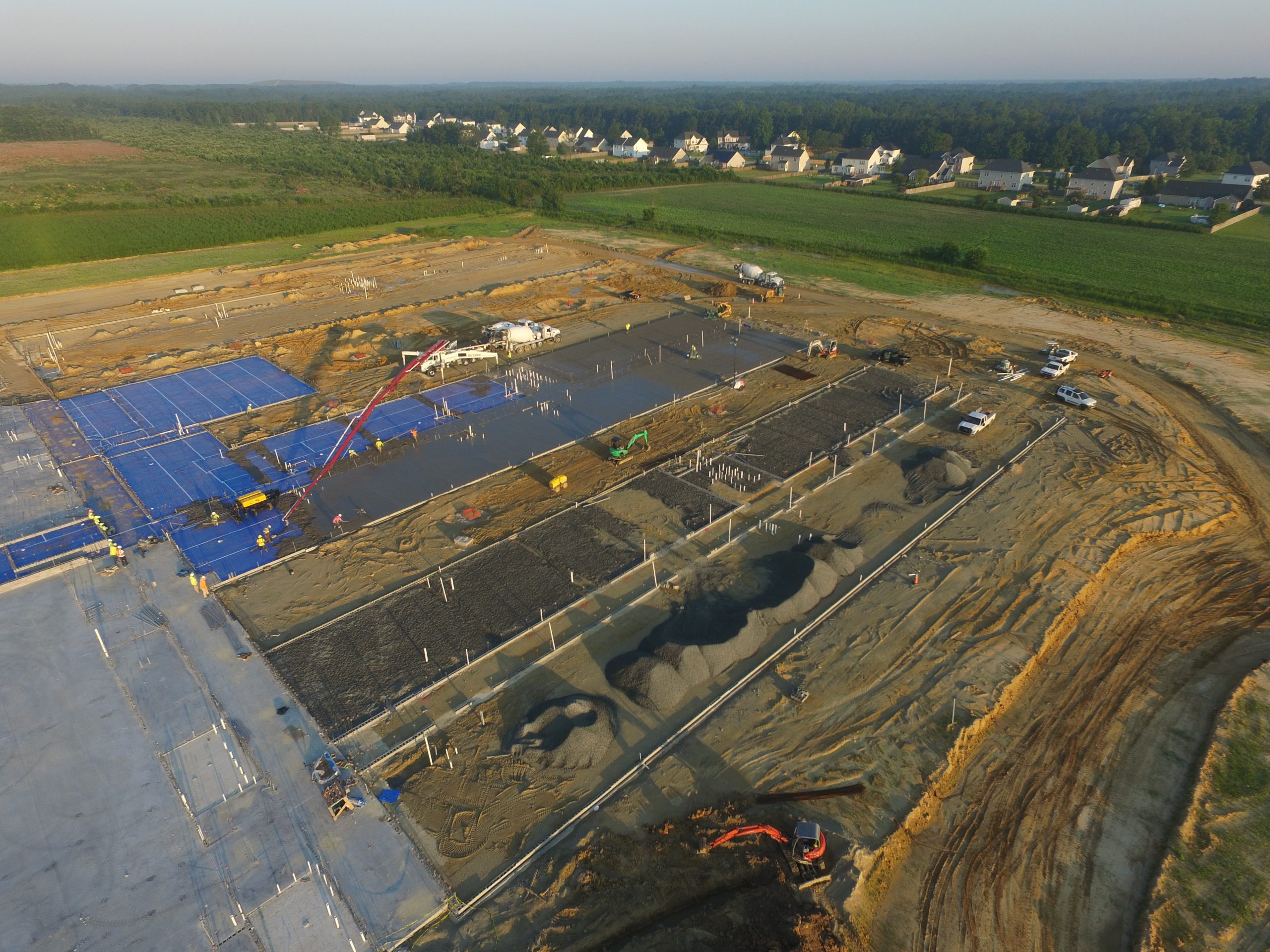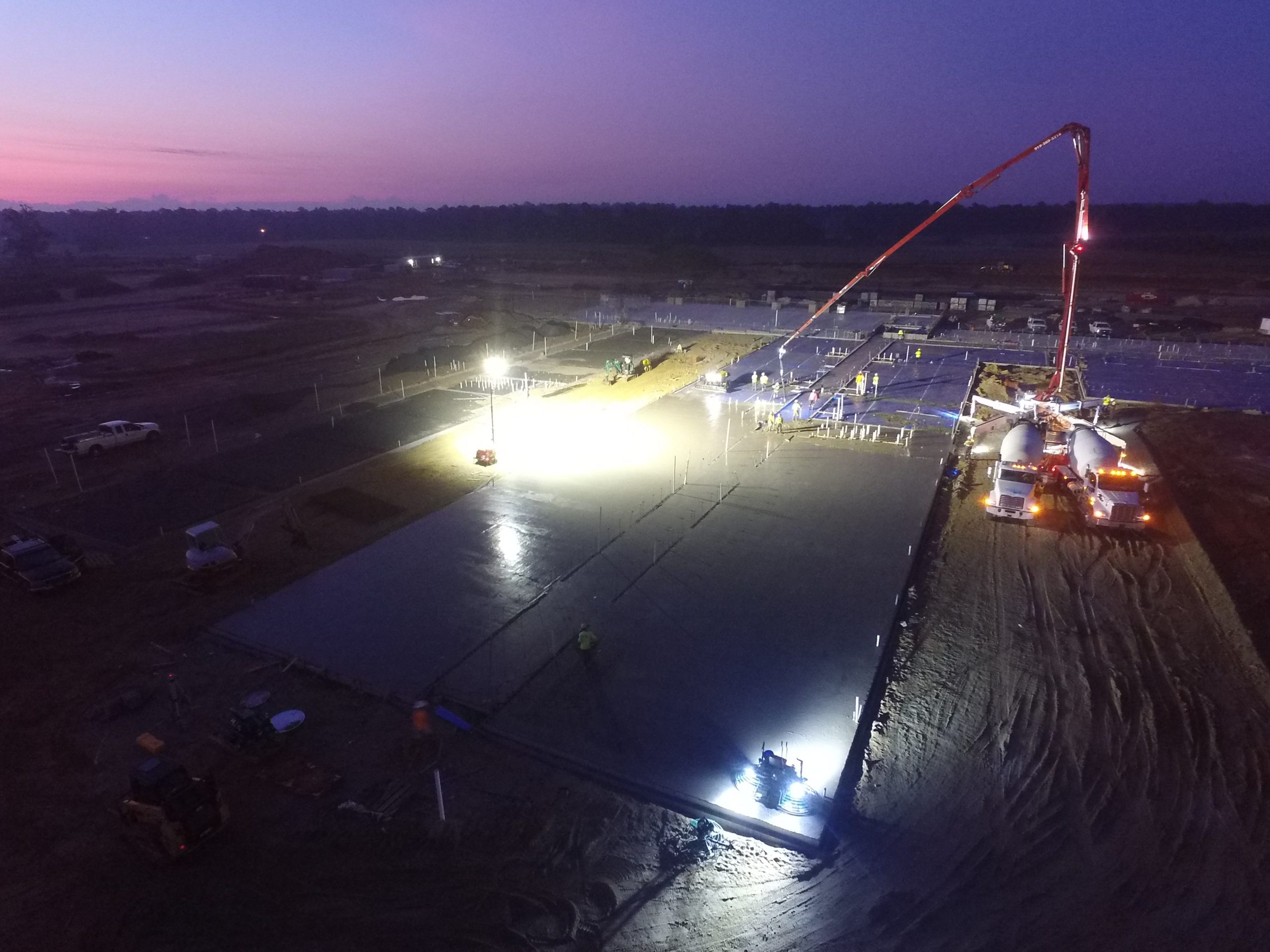 Large concrete placements in the summertime mean very early starts for the project team in order to beat the heat and provide the best quality product. This particular placement at the future site of Catherine Lakes Elementary School in Onslow County began at midnight with setting up the pump truck. The first of many concrete trucks arrived around 1:30 to begin the 10+ hour activity. Brickworks, Inc. has been an excellent partner for Daniels & Daniels and their crews worked tirelessly and efficiently through the morning to completion. The are several more placements to go, but the team has kept up with the schedule even given the heavy rains since the start of the project.